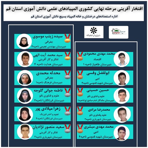 سید محمدعلی صمدانی، رئیس اداره استعدادهای درخشان اداره کل آموزش و پرورش استان قم اظهار کرد: «دانش آموزان برگزیده استان قم در تلاشی با مشارکت خانه المیپاد علمی بسیج دانش آموزی و اداره استعدادهای درخشان آموزش و پرورش قم موفق به کسب مدال های رنگارنگ در مرحله نهایی المپیاد علمی شدند.»