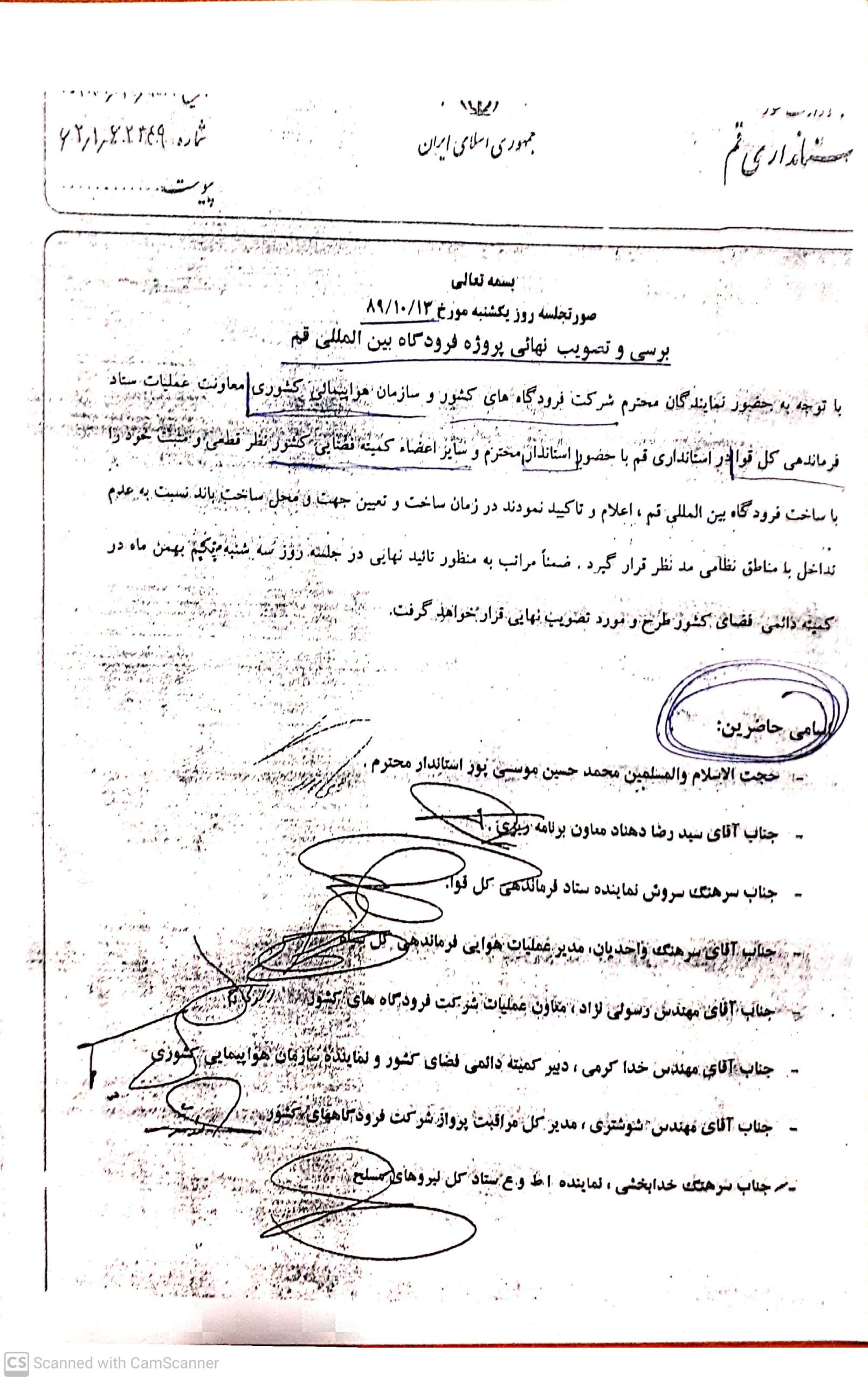 زمین فرودگاه ۱۰ هزار هکتار است که در کارگروه شهرسازی با سه هزار هکتار آن برای ساخت فرودگاه موافقت شده است؛ ما دراین مدت بارها به استانداران قم به خصوص آقایان سرمست و سردار شاهچراغی نامه نوشتیم و از همه مسئولان مرتبط ازجمله منابع طبیعی و سازمان جنگلها خواستیم یک نامه بدهند که ما مجوز و سند فرودگاه را دریافت کنیم هیچ کدام ندادند؛ ۱۳ سال است سرمایه و زندگی من در گرو یک نامه است.