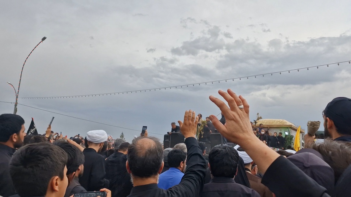 عدهای مردم را به عقب هدایت میکردند که به کسی آسیب وارد نشود؛ خودروی حامل پیکرها به هر جا که میرسید مردم با سر دادن فریاد «یا حسین» بر سر و سینه میزدند و صدای گریه محوطه را فرا میگرفت.