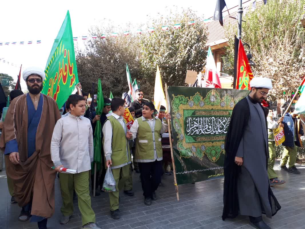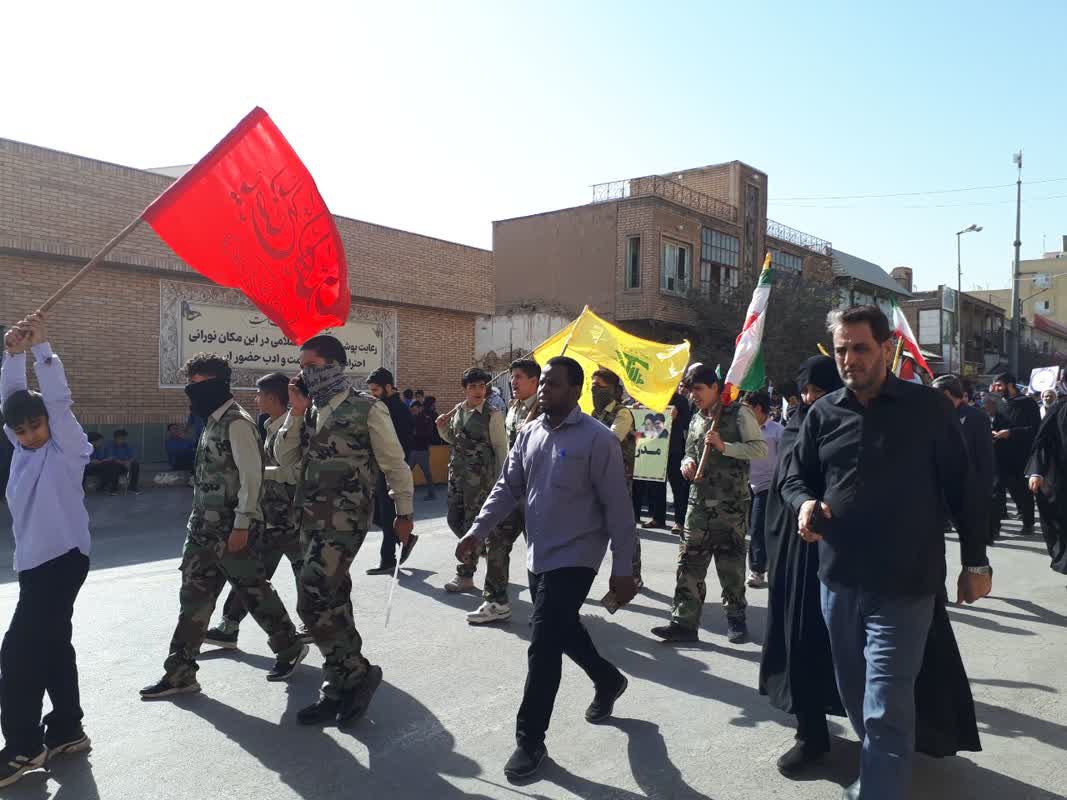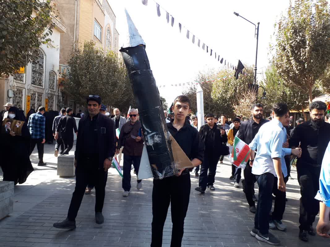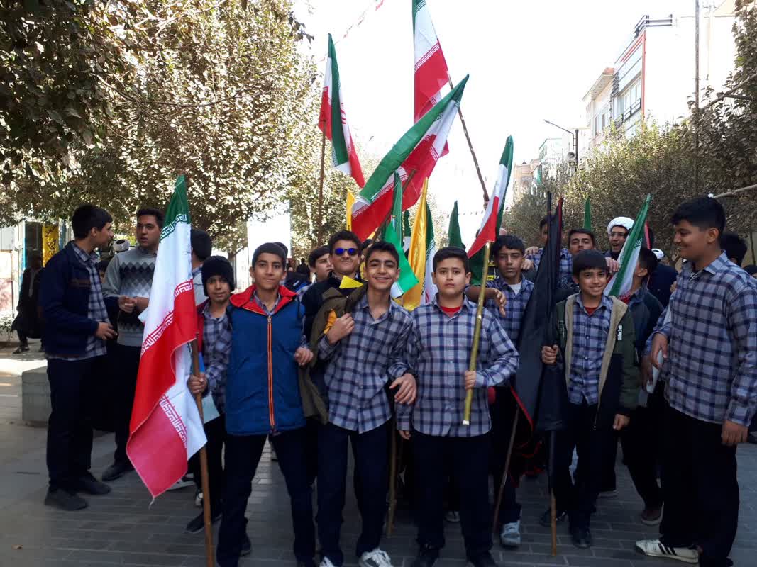 راهپیمایان با در دست داشتن تصاویر شهدای مدافع حرم و شهیدان انقلاب اسلامی، ضمن گرامیداشت یاد و خاطره آنان، بر تداوم راه شهیدان و ایستادگی در برابر استکبار جهانی تأکید کردند.