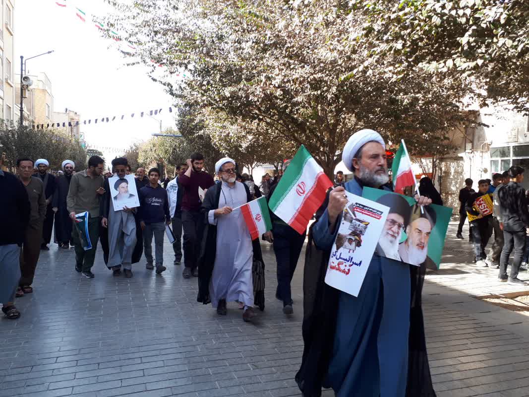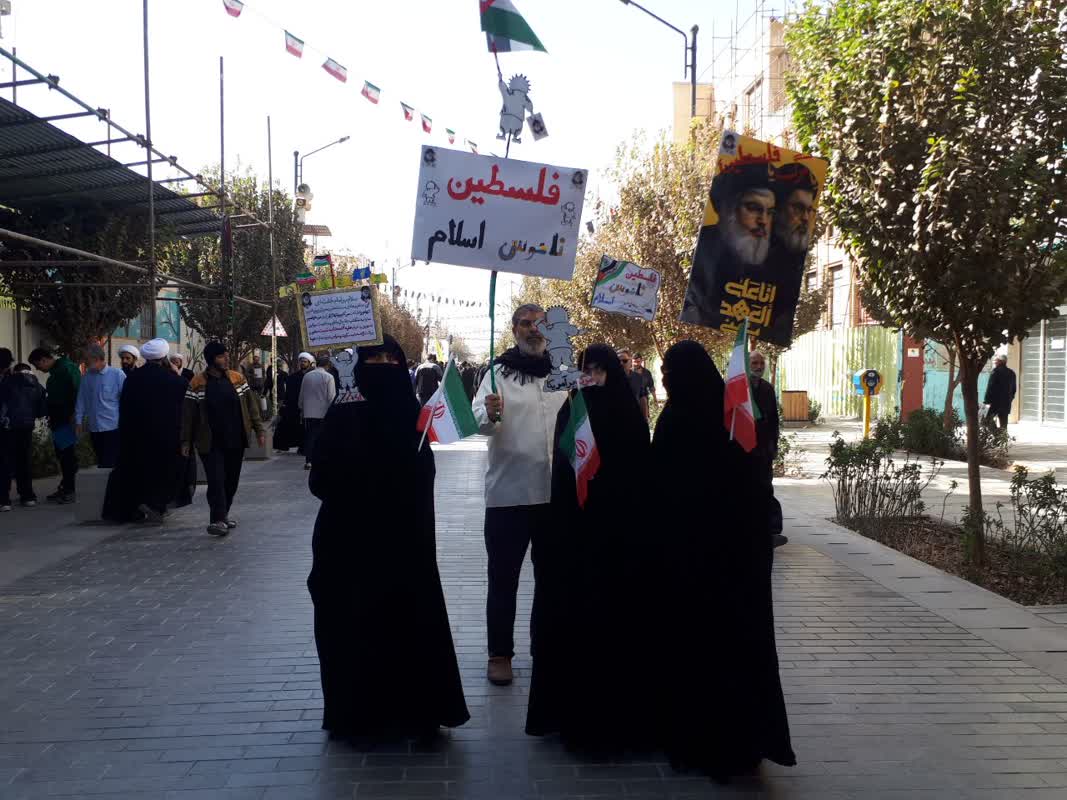 همچنین پرچمهای ایران و فلسطین در دستان مردم برافراشته بود و پلاکاردهایی در حمایت از ملت مظلوم فلسطین و محکومیت جنایات رژیم صهیونیستی به چشم میخورد.