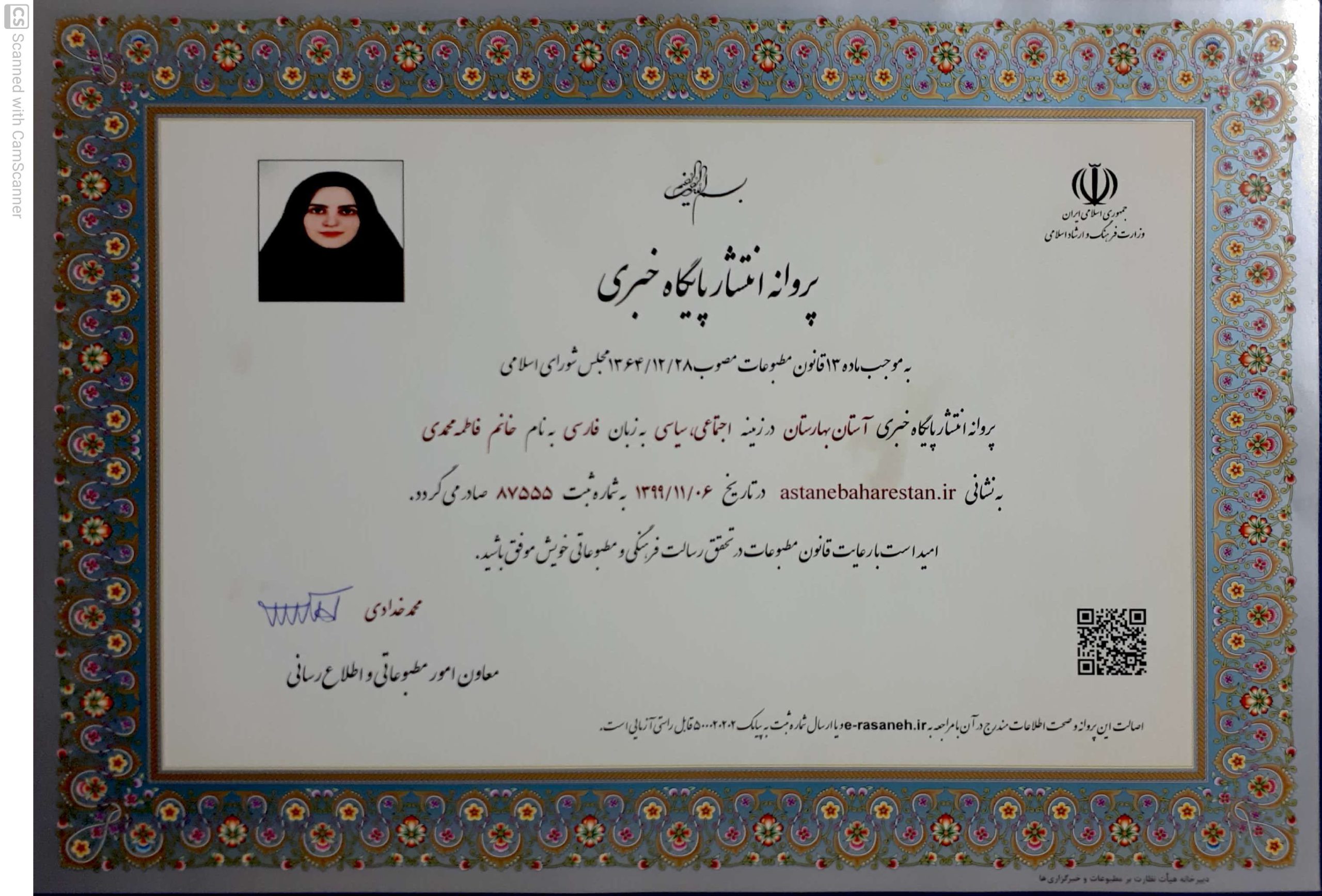 پروانه انتشار پایگاه خبری آستان بهارستان در زمینه اجتماعی و سیاسی به نشانی https://astanebaharestan.ir از تاریخ ششم بهمن‌ماه سال ۱۳۹۹ به شماره ثبت ۸۷۵۵۵ از وزارت فرهنگ و ارشاد اسلامی صادر و فعالیت این پایگاه خبری آغاز شد.